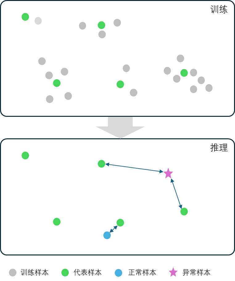 • 参数 “代表样本数量”:对检测结果具有较为显著的影响,如果数量设置太小,可能无法覆盖OK样本可能出现的各种情况,导致模型过检严重;代表样本数量过多,则推理时需要比对的样本变多,模型体积会增大,推理所需占用的显存资源较多,且推理时间会变慢。使用时需要根据实际情况调节这一参数以达到最佳平衡。