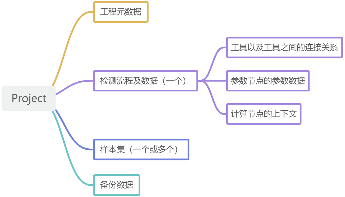 在了解了VisionFlow中的检测流程图和样本集的概念后,我们就可以比较容易理解VisionFlow中的工程的作用了。为了方便 管理一个检测流程以及与这个检测流程相关的样本集、参数以及计算节点的上下文等所有数据,我们把这些数据都放到一个 工程中,并在检测流程发生变化时同步自动维护相对应的数据。VisionFlow 工程由以下几部分构成: